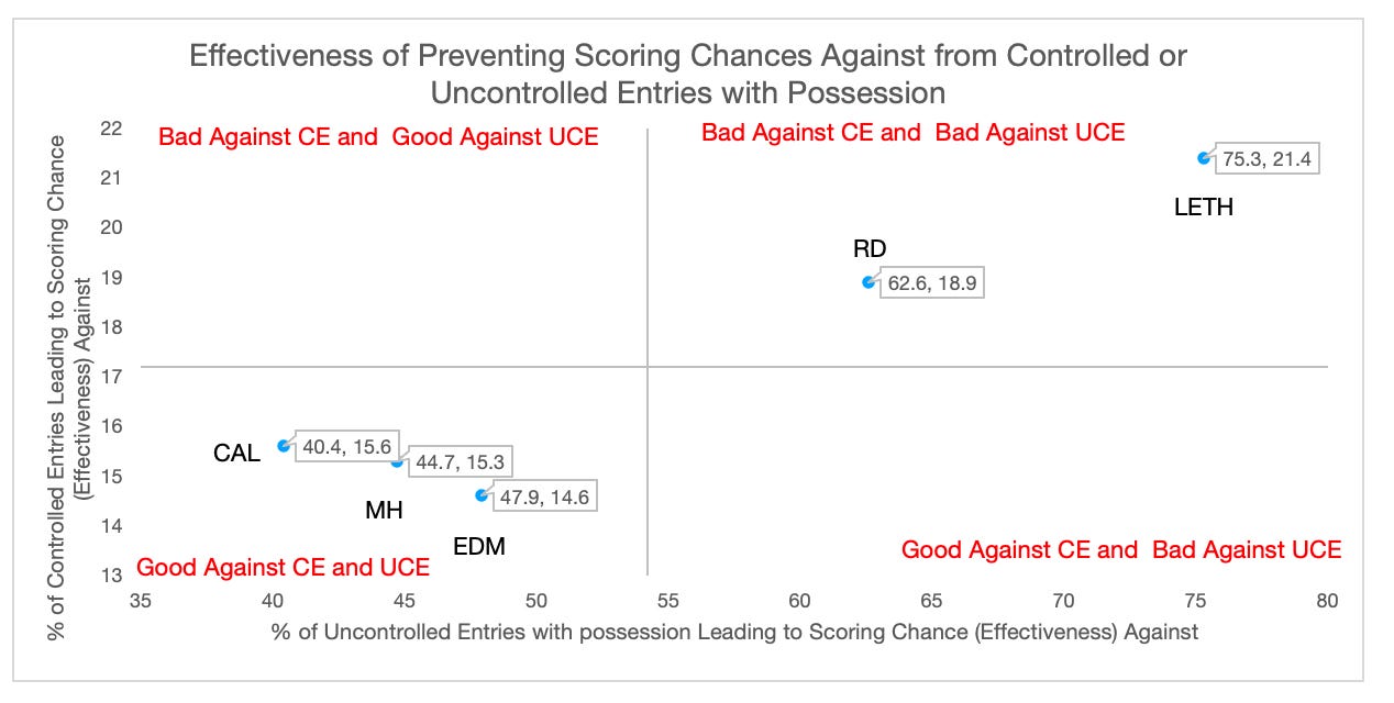 As you can see the teams in the top 3 spots in the standings have the best defense against scoring chances from controlled and uncontrolled entries. The bottom two teams have the worst.