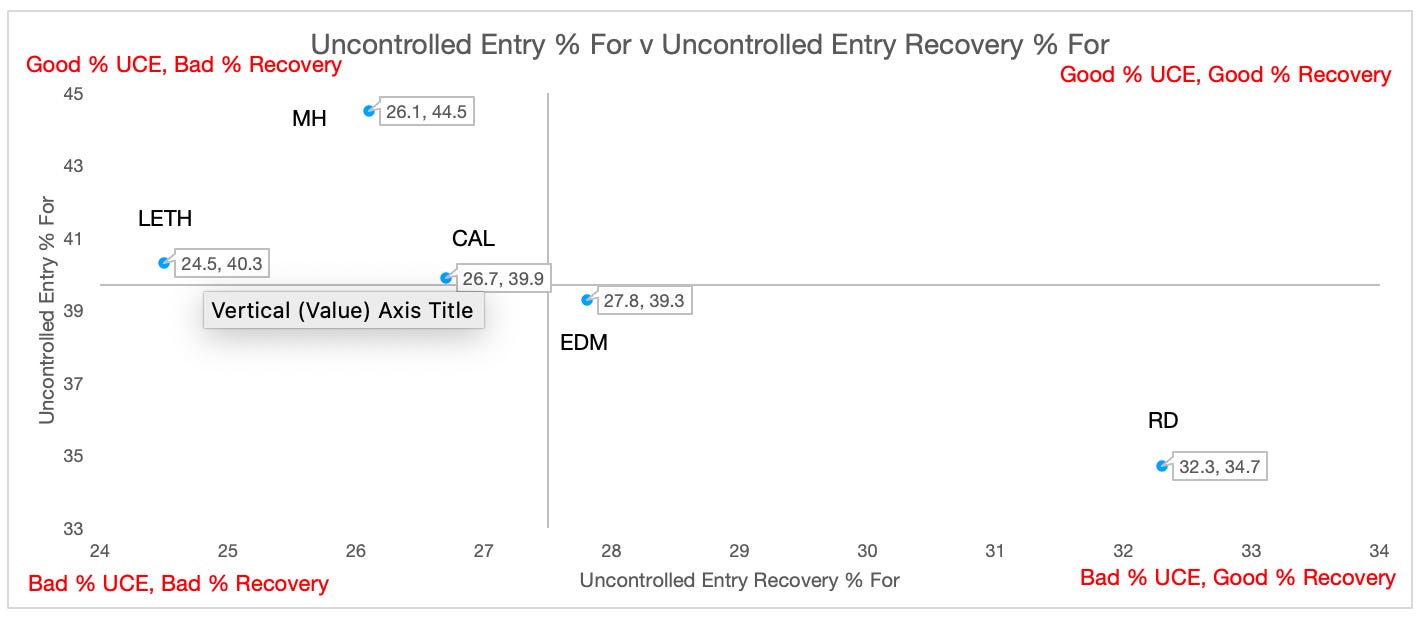 To do this we can look at a scatter plot of uncontrolled entry % vs. uncontrolled entry recovery %.