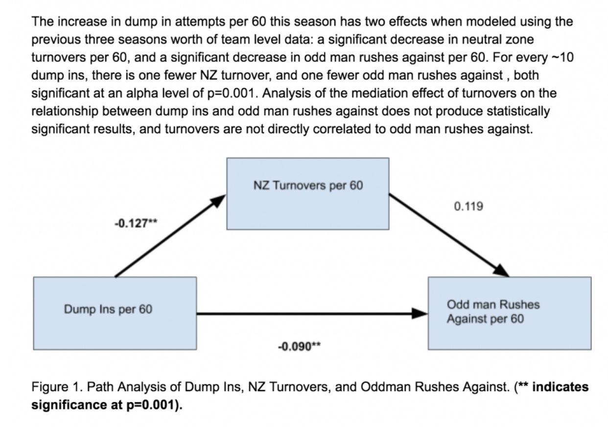 The more you dump the puck in, the less you turn it over in the neutral zone and the fewer odd-man rushes you allow, despite there not being a statistically significant link directly between neutral zone turnovers and odd-man rushes.