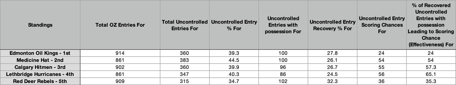 From the tables above we know which teams rely on uncontrolled entries as a way of entering the OZ. Medicine Hat leads the way, while Edmonton, Calgary ad Lethbridge have a more balanced attack. Edmonton rarely uses uncontrolled entries as a method of entering the OZ.