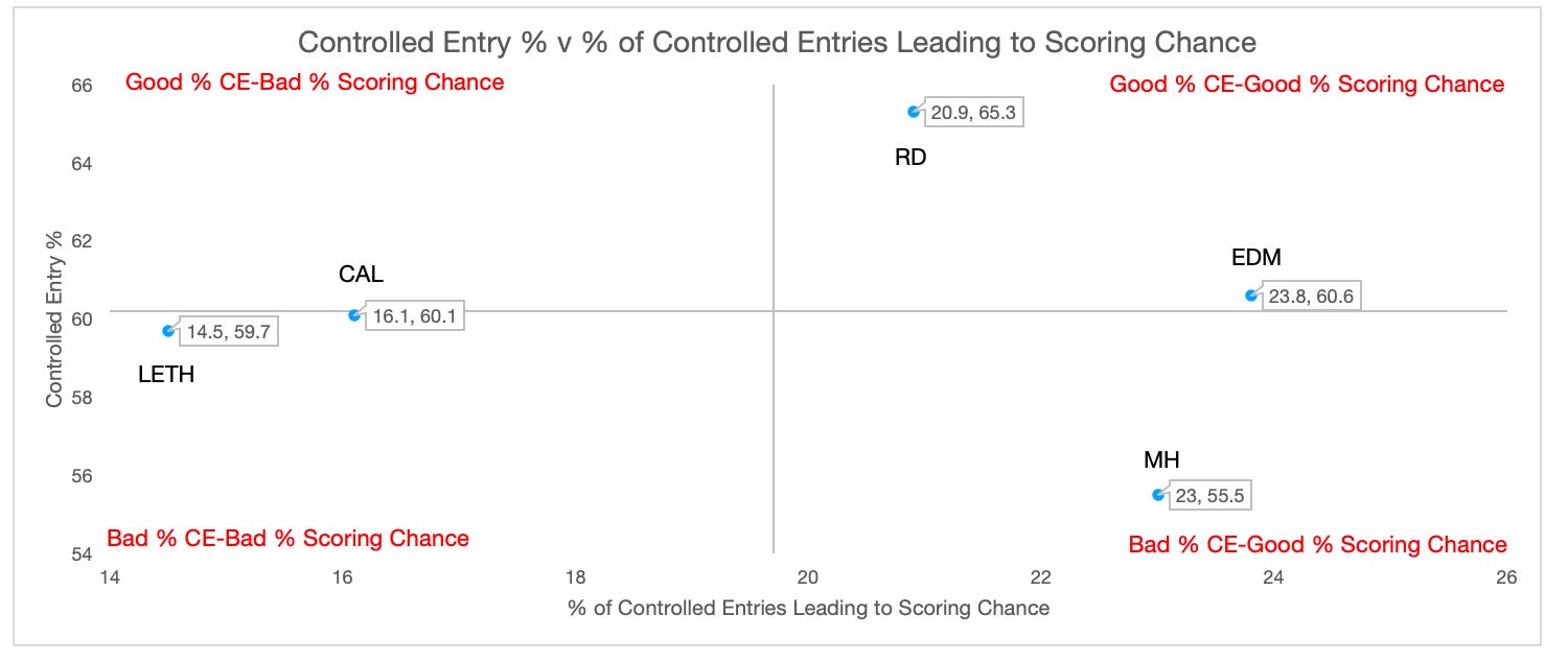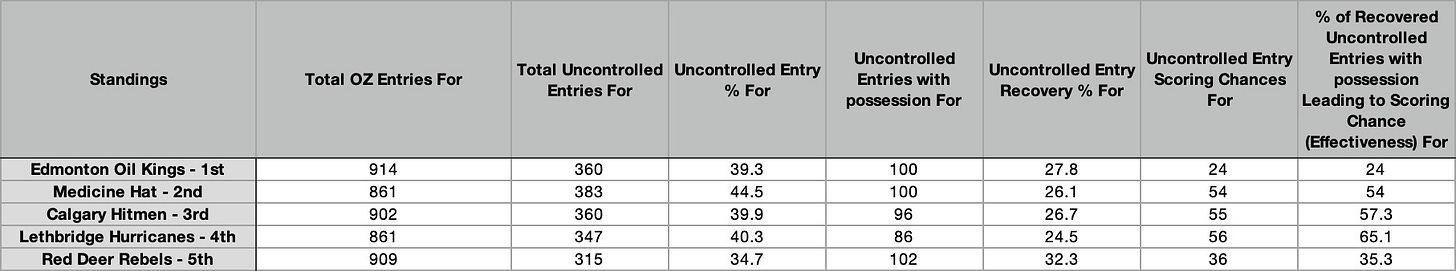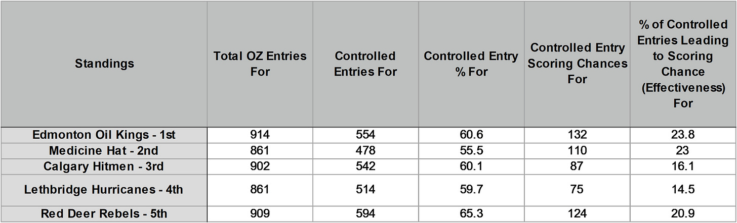 So Red Deer relies predominantly on controlled entries to make up a lion share of their OZ entries and they are good at generating scoring chances off those entries. Medicine Hat is more of an uncontrolled entry team but is good at generating scoring chances off their controlled entries. Lethbridge and Calgary are average in terms of controlled entry % but are poor at generating scoring chances off their opportunities. Edmonton is average at controlled entry % but in 1st place at generating scoring opportunities off those controlled entries.