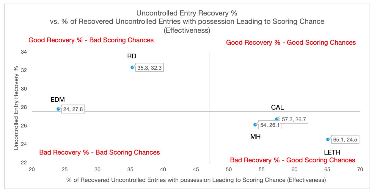 Rely on a somewhat balanced attack between controlled and uncontrolled entries. They generate the highest % of scoring chances for their number of controlled entries for all 5 teams. Edmonton has the 2nd best puck recovery % from uncontrolled entries but is in last place for % of scoring chances generated off these recovered uncontrolled entries. This may be an area for research on how to improve scoring chances of recovered uncontrolled entries.