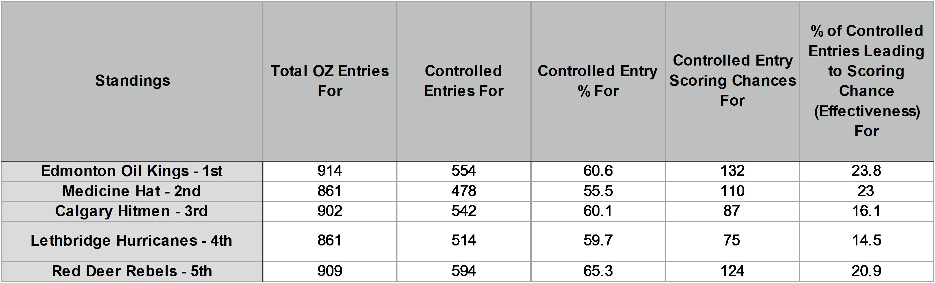 Red Deer who relies on controlled OZ entries more than uncontrolled entries surprisingly are good at recovering dumped pucks but are not very good at generating scoring chances from these recovered pucks. Edmonton who relies more on a balanced attack has an average puck recovery rate of dump ins but is also very poor at generating scoring chances of recovered pucks. Calgary and Lethbridge who rely on a more balanced attack are below average in uncontrolled entry puck recovery but are well above average in generating scoring chances off these recovered pucks. Medicine Hat relies primarily on uncontrolled entries but are above average in generating scoring chances off recovered pucks.