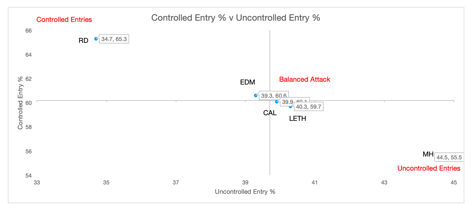 Secondly, if we look at a scatter plot, Red Deer relies heavily on controlled OZ entries while MH relies heavily on uncontrolled entries. The other 3 teams in the Alberta division have a balanced attack involving both controlled and uncontrolled entries.