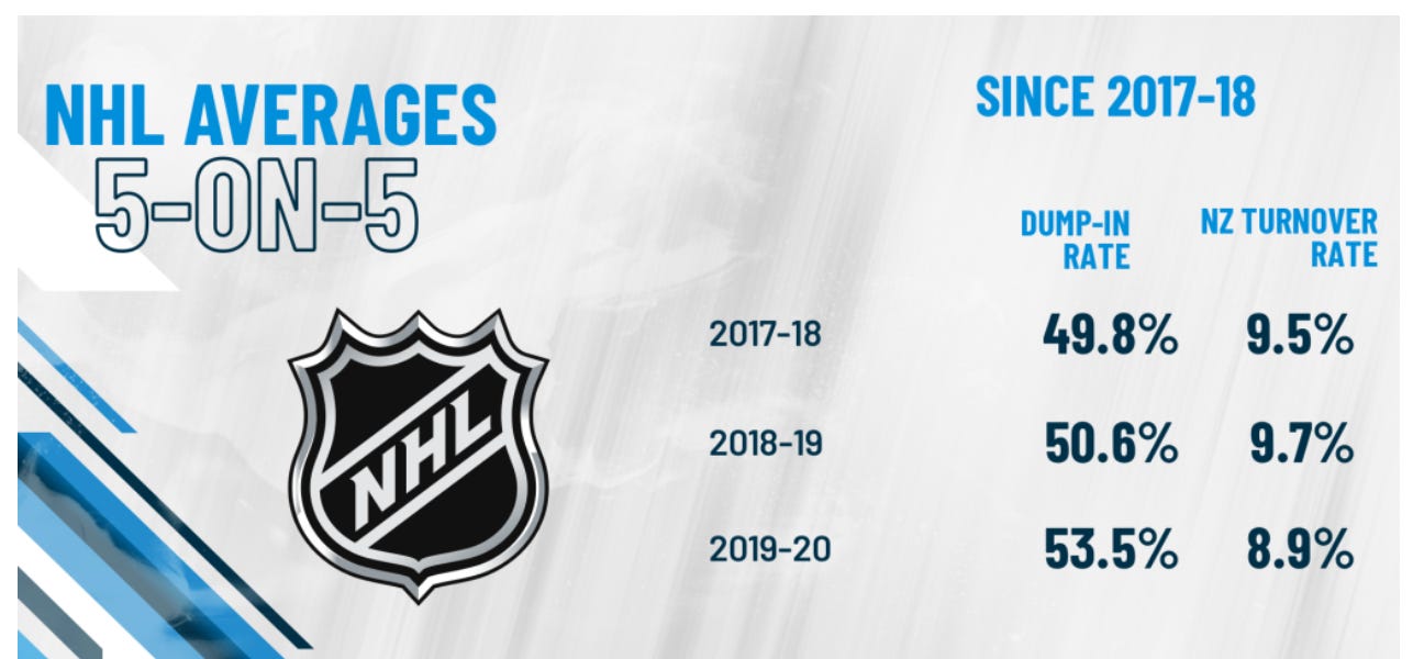 This chart from Dump Ins: A Trend on the Rise from The Point Hockey shows this point when analyzing NHL data from past 3-4 seasons.